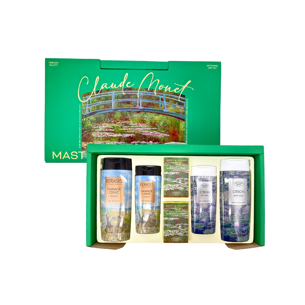 Este set premium de la Colección Claude Monet ofrece una rutina completa de cuidado capilar y corporal, combinando productos de las líneas Kerasys Hair Clinic y Shower Mate. Todos los productos están elaborados con fórmulas de alta calidad y sus envases están elegantemente decorados con obras del maestro impresionista, lo que lo convierte en un regalo ideal o una experiencia de autocuidado inmersiva.