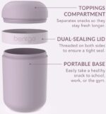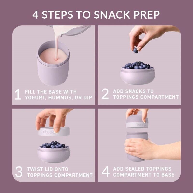 Mantén el granola, frutos secos, papas fritas o frutas separadas de los alimentos cremosos con un compartimiento de 0.5 taza para coberturas que se adhiere a la base de 2 tazas con una tapa de doble sellado. ¡Prepara un parfait de yogur o sumerge tus papas fritas en guacamole cuando estés listo para disfrutar!