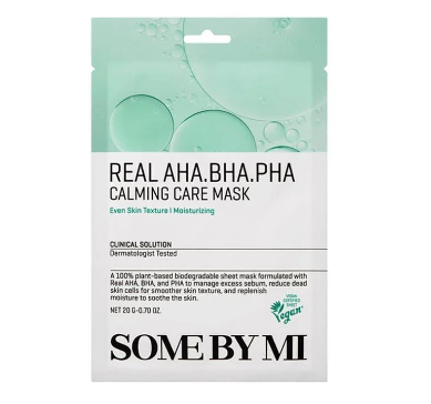 Purifica y renueva la piel con la Real AHA BHA PHA Calming Care Mask de Some By Mi, una mascarilla en hoja vegana y biodegradable que combina exfoliación suave, acción calmante e hidratación profunda en un solo paso.